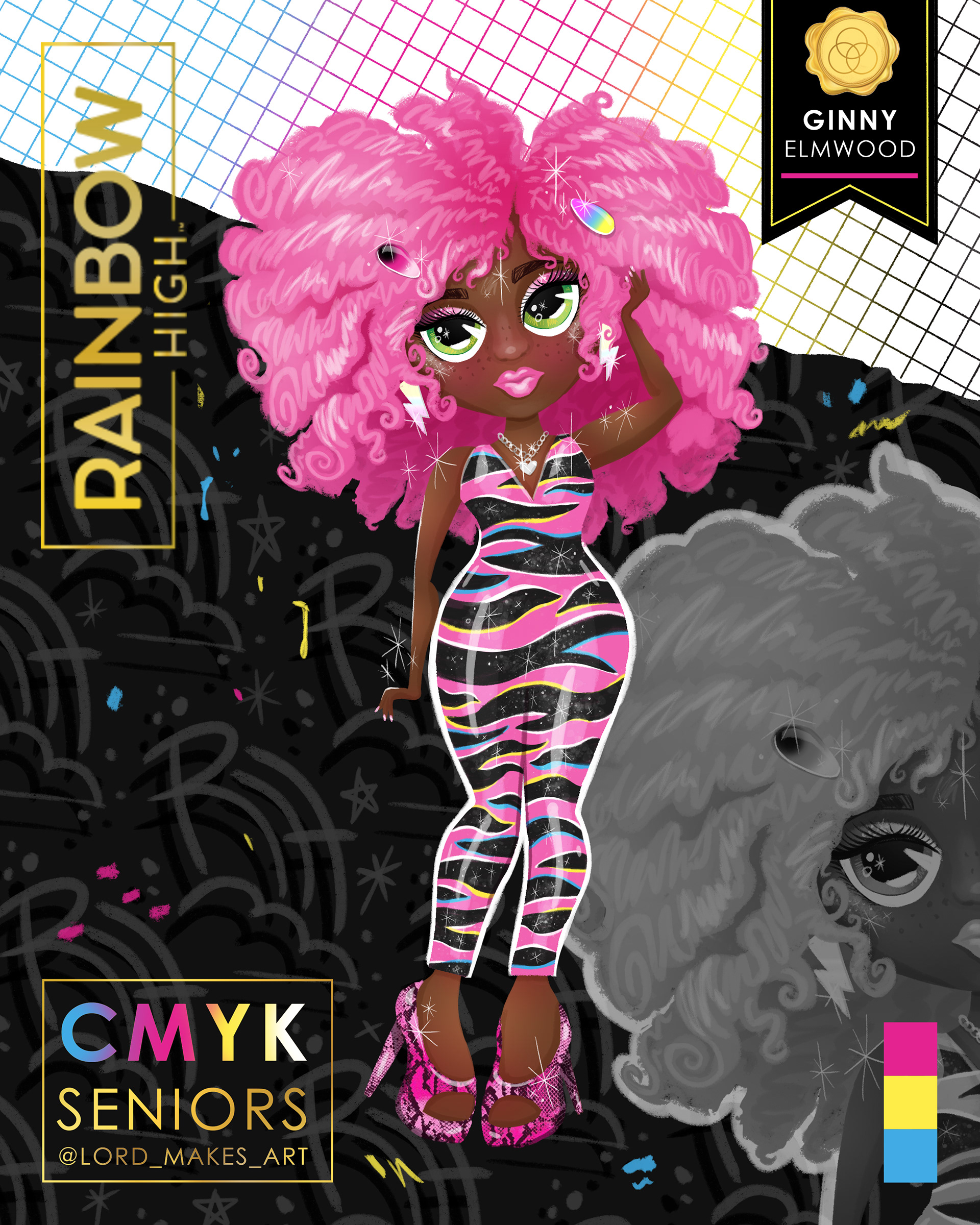 I took inspiration from the preexisting doll brand Rainbow High, to create my own line of colorful characters that are all based on a CMYK color palette. CMYK stand for Cyan, Magenta, Yellow and Black. These colors are used in printing but make up an awesome color scheme that would make a great addition to the halls of Rainbow High. Each color is represented by a student but I also wanted to add a character with a white a color scheme to represent paper white. The moodboards I created for each person contain photos that are not mine but I did do some color and photo editing to make them appeal more to the character I wanted to make. I had a lot of fun coming up with their names and showing their personalities through fashion.
