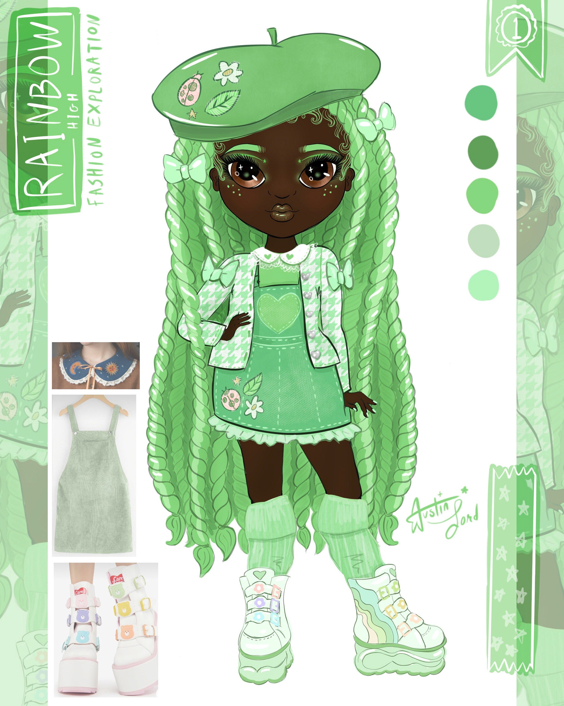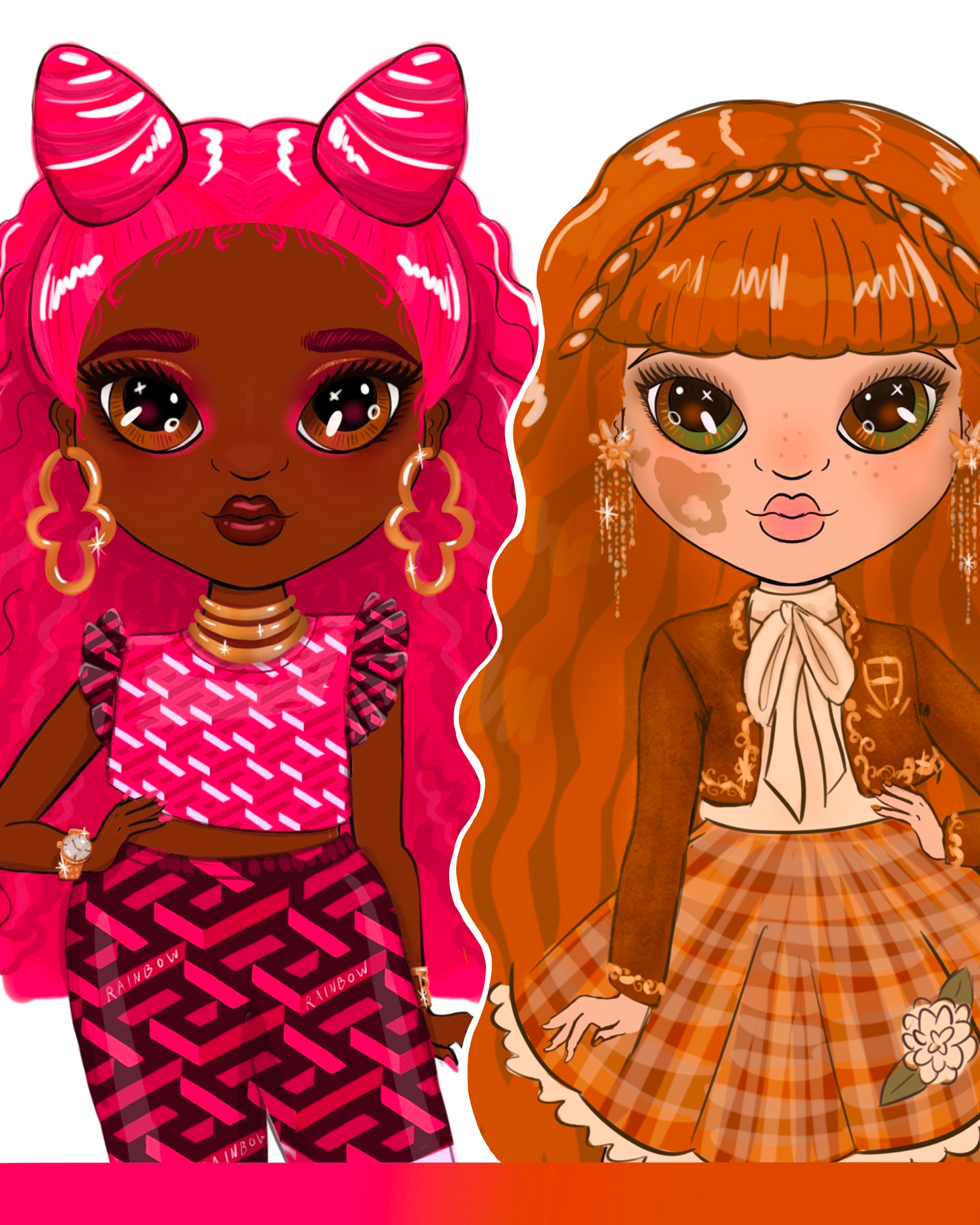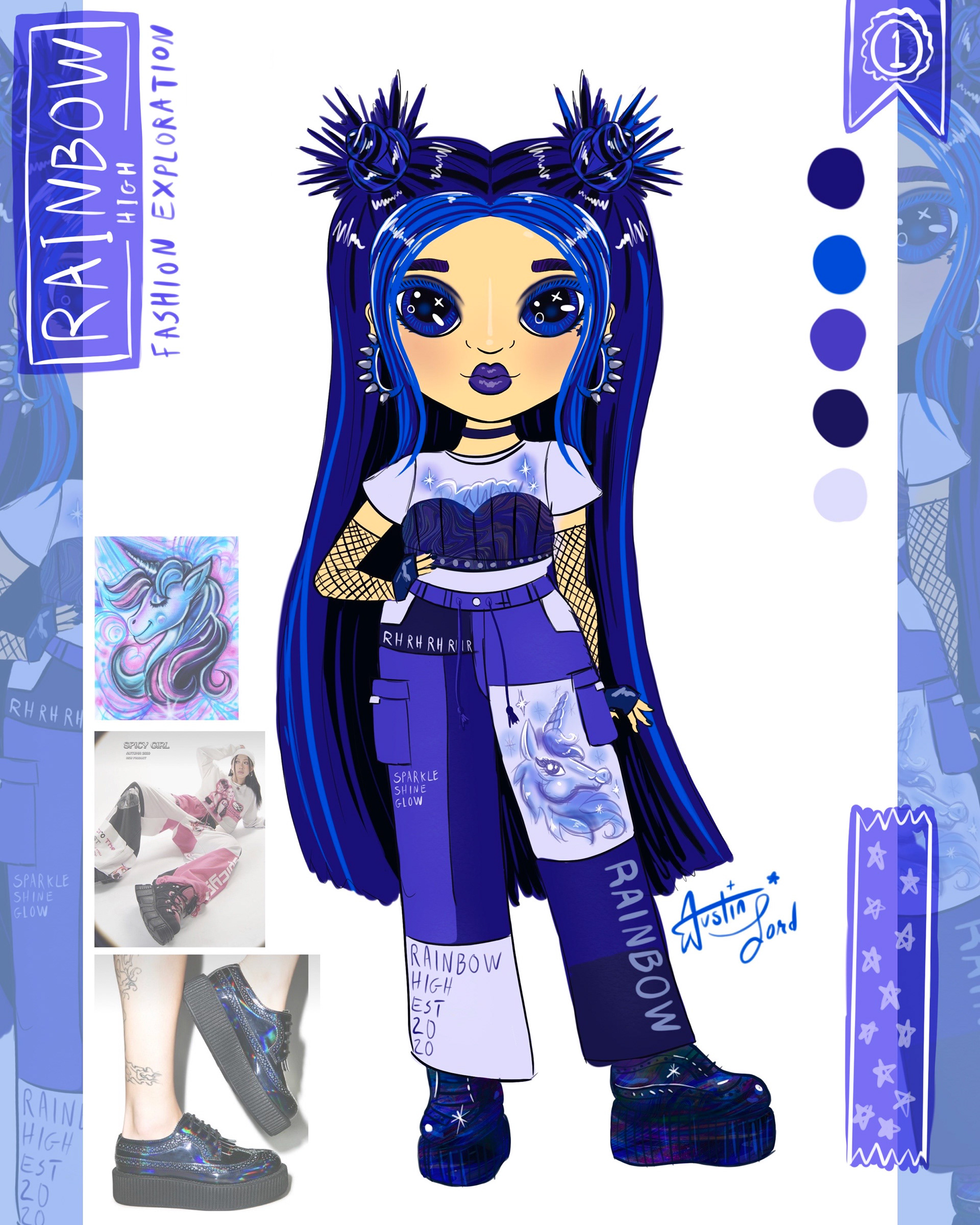 Fashion and character design explorations for a series of dolls based on the popular doll brand, Rainbow High. I explored colors and fashion trends not really portrayed in the doll brand currently.