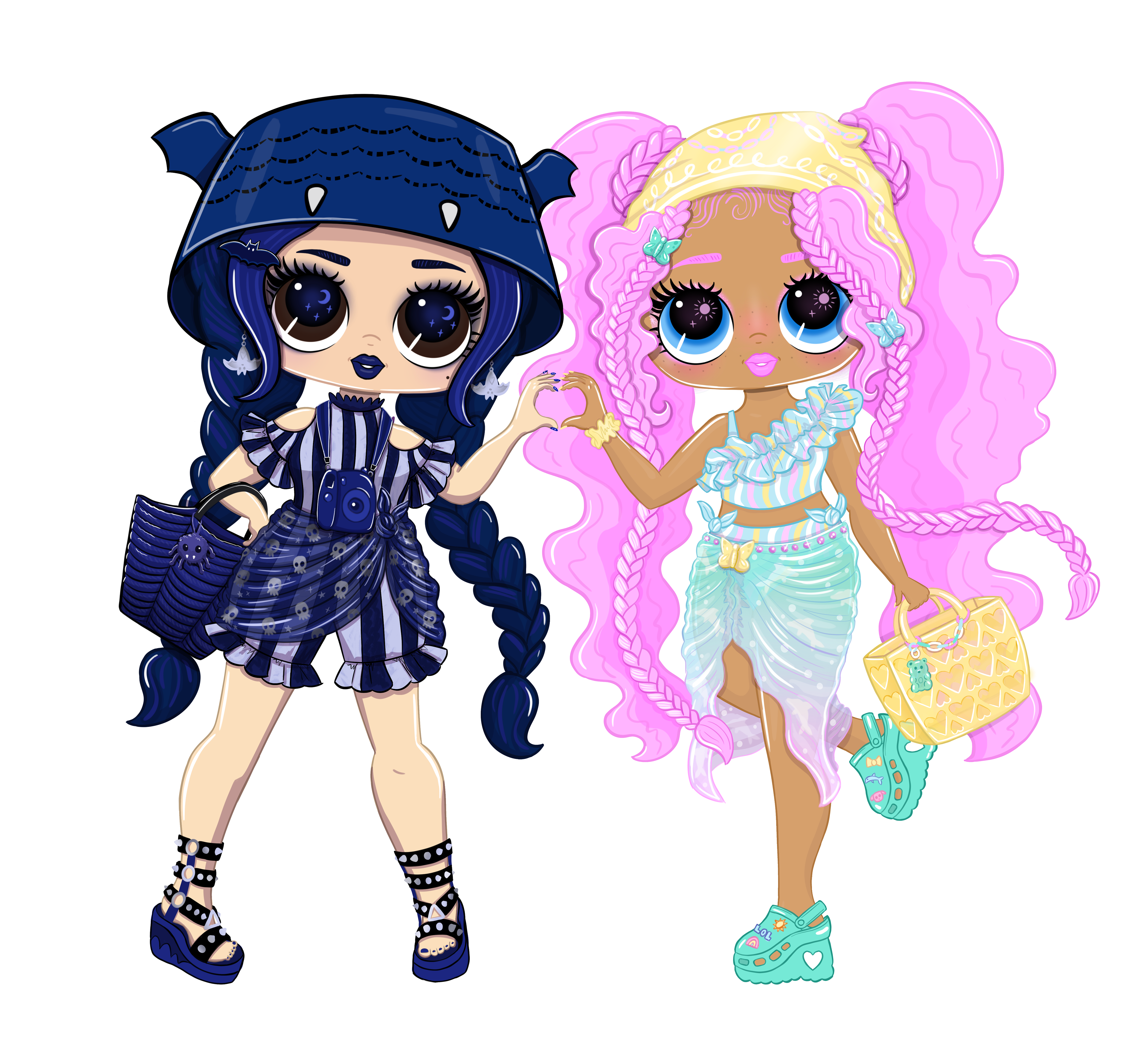These are doll concepts for a two pack of LOL Surprise Tween dolls. Normally I do my own background artwork but this specific background art was made by my friend. The designs of the dolls, accessories, and clothes are all mine.