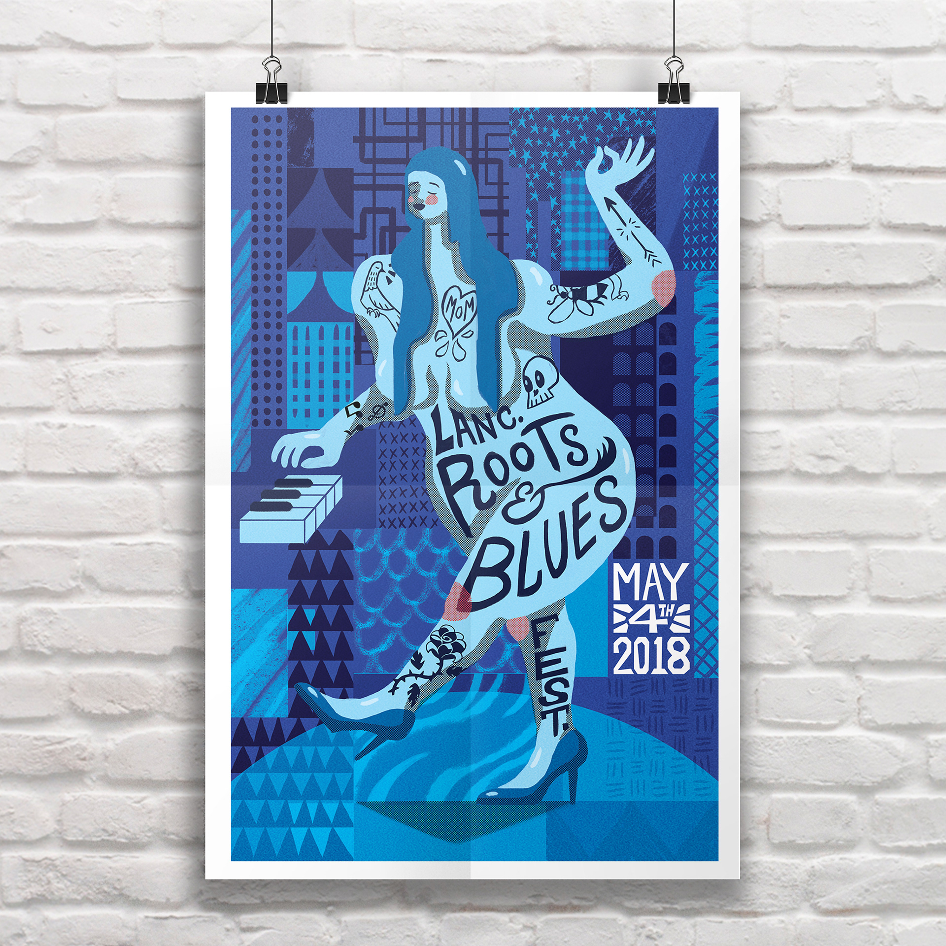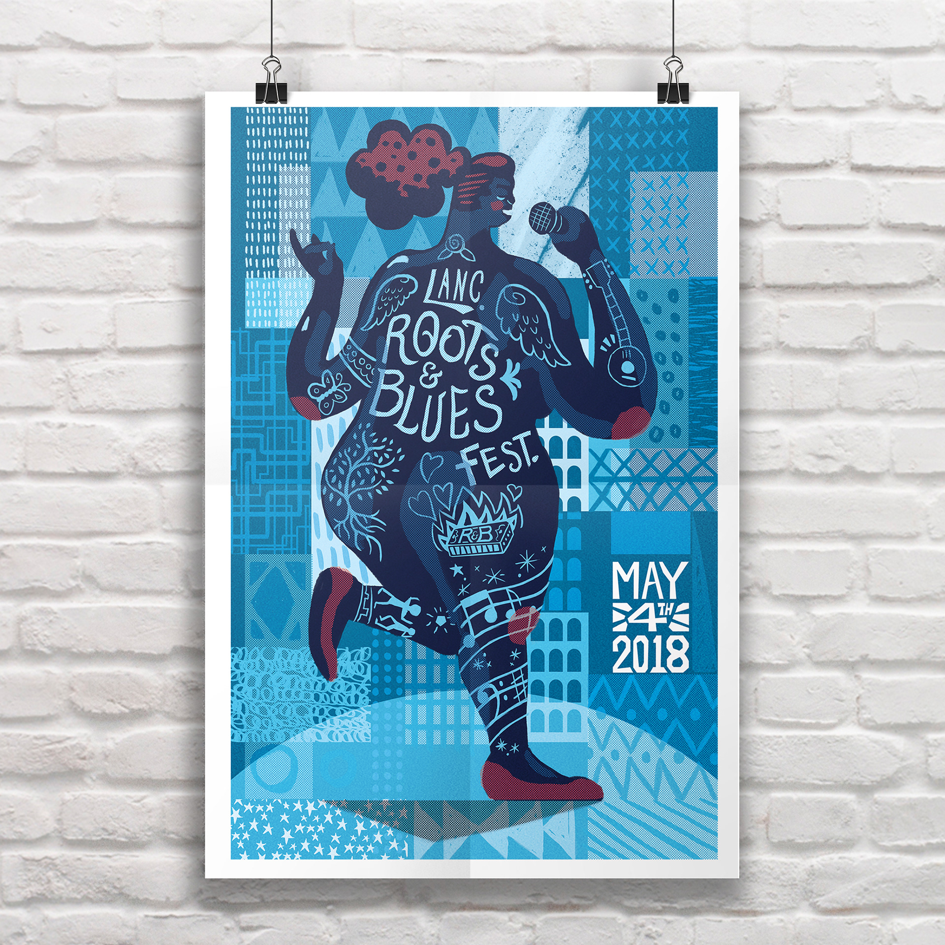 My Senior thesis was creating poster designs and merchandise for the Lancaster Roots and Blues festival. This project has a five poster series, denim jackets, t-shirts, patches, temporary tattoos, an album cover design, and stickers,